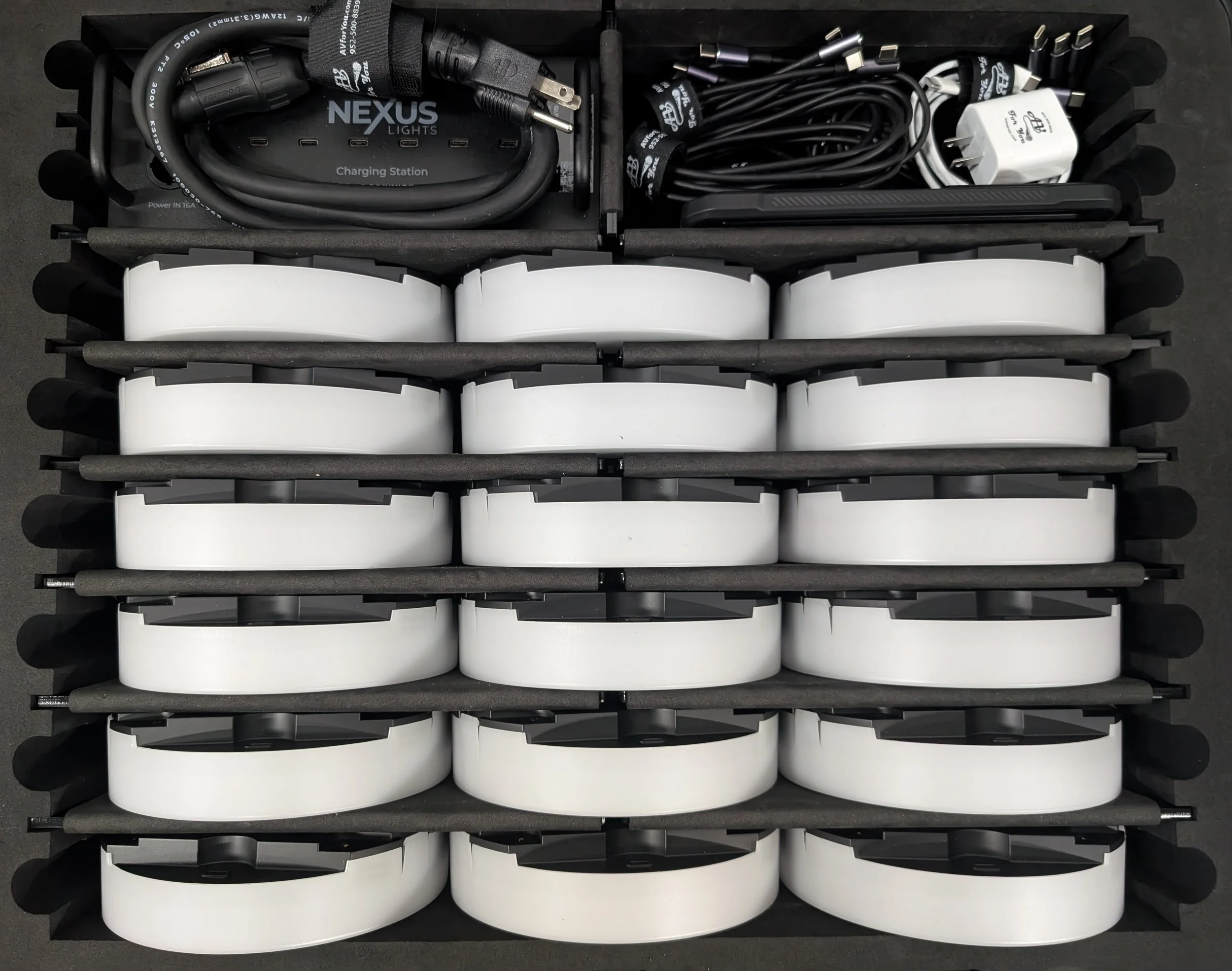 18 pack case of GLP Nexus Circle LED Panel lights with an 18 Way USB-C charging station. Includes a tru-con cable, 18 USB-C 90-degree Cables and iPad mini (to control/program lights).