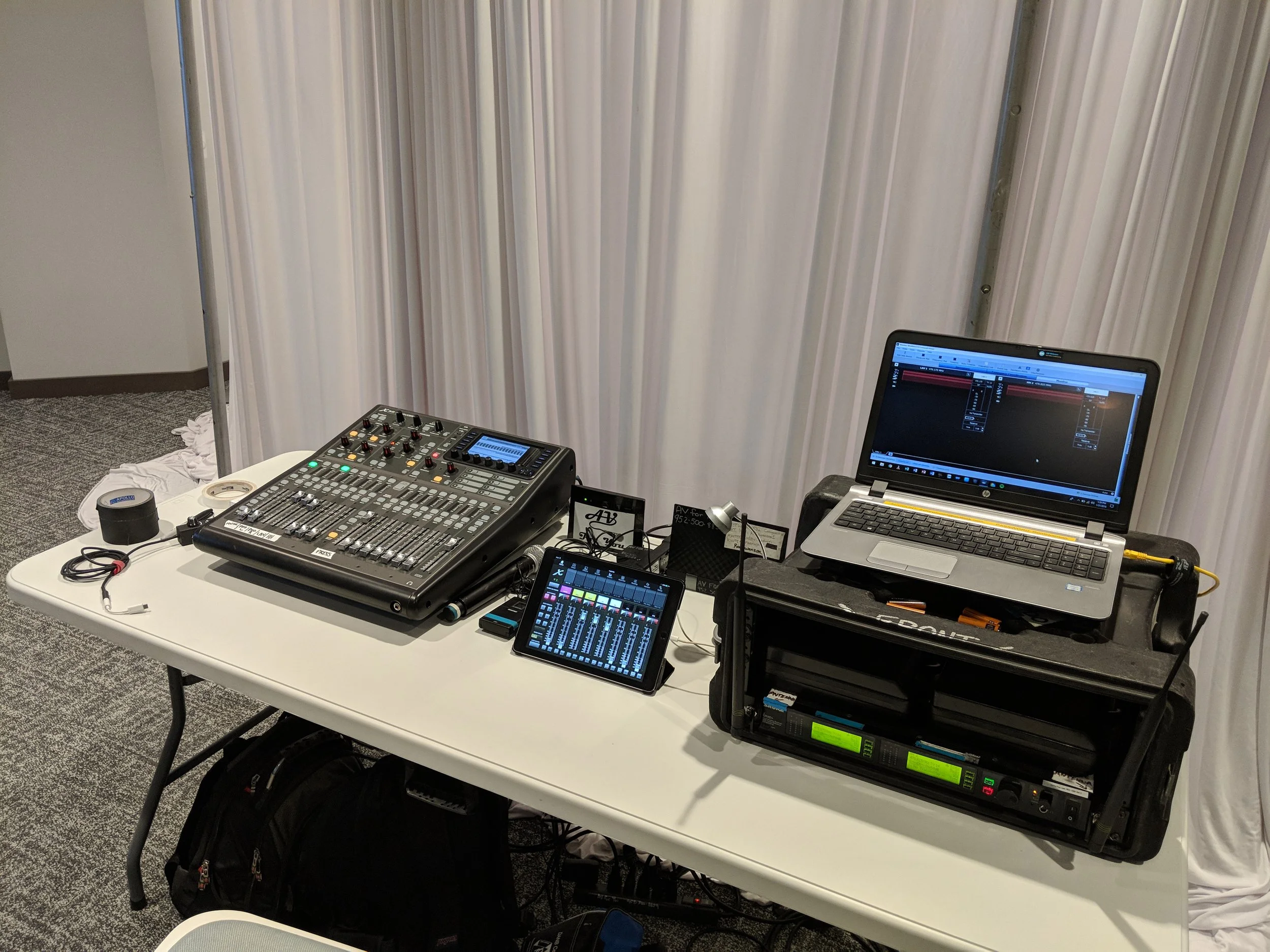 We used two of our QSC K10 Powered Speakers on stands in each corner at the front of the room. We set up two of our press boxes on each side of the room for press. We also provided our Audio Technica Podium Microphones at our Frosted Podium on stage.
